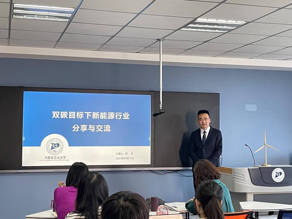 2023年4月11日,伟德邀请公司工学博士、高级工程师、金风科技公司开发总监薛宇,作题为《走近新能源——双碳目标下新能源行业分享与交流》的讲座,讲座由董君教授主持。