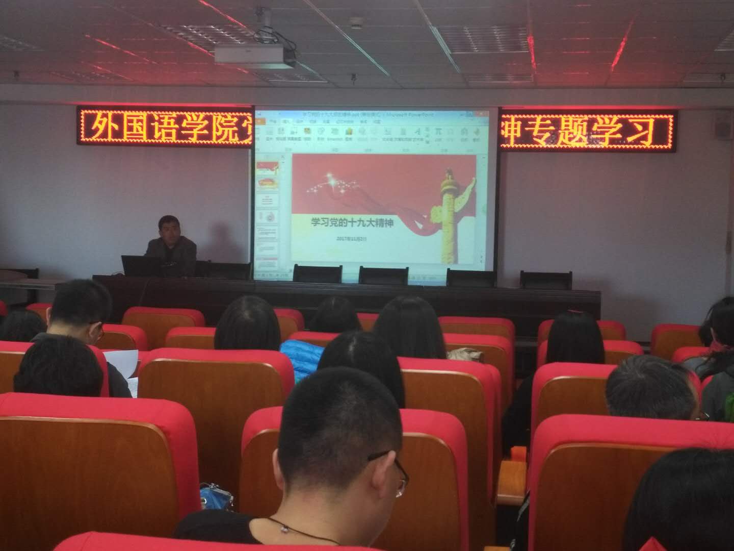 霍天瑞着重从“党的十九大召开的时代背景”、“报告内容分析与解读”、“报告重要影响与意义”等三个部分谈了自己的初步学习体会。内容涵盖大会主题、过去五年的十大历史性成就、党的十九大提出的两个重要判断、一个历史使命与“四个伟大”、一个重要思想以及新时代坚持和发展中国特色社会主义的14条基本方略等八个方面重要内容,带领与会教职员工学习领会党的十九大报告的核心内容和思想内涵。