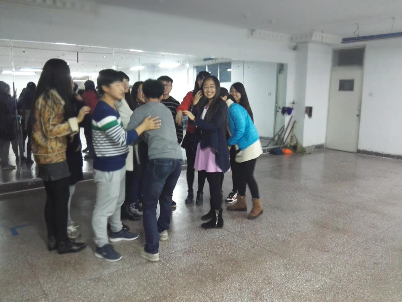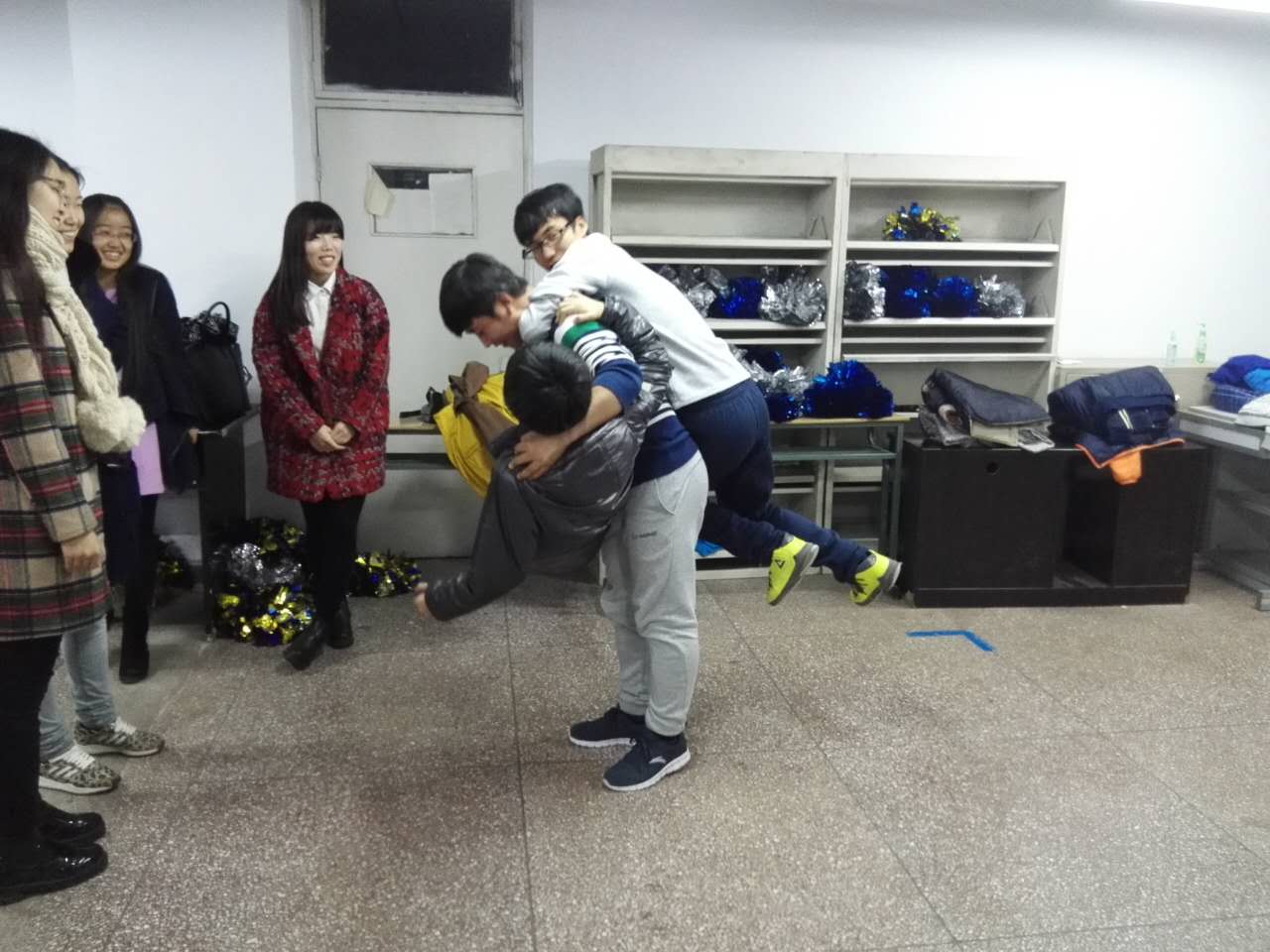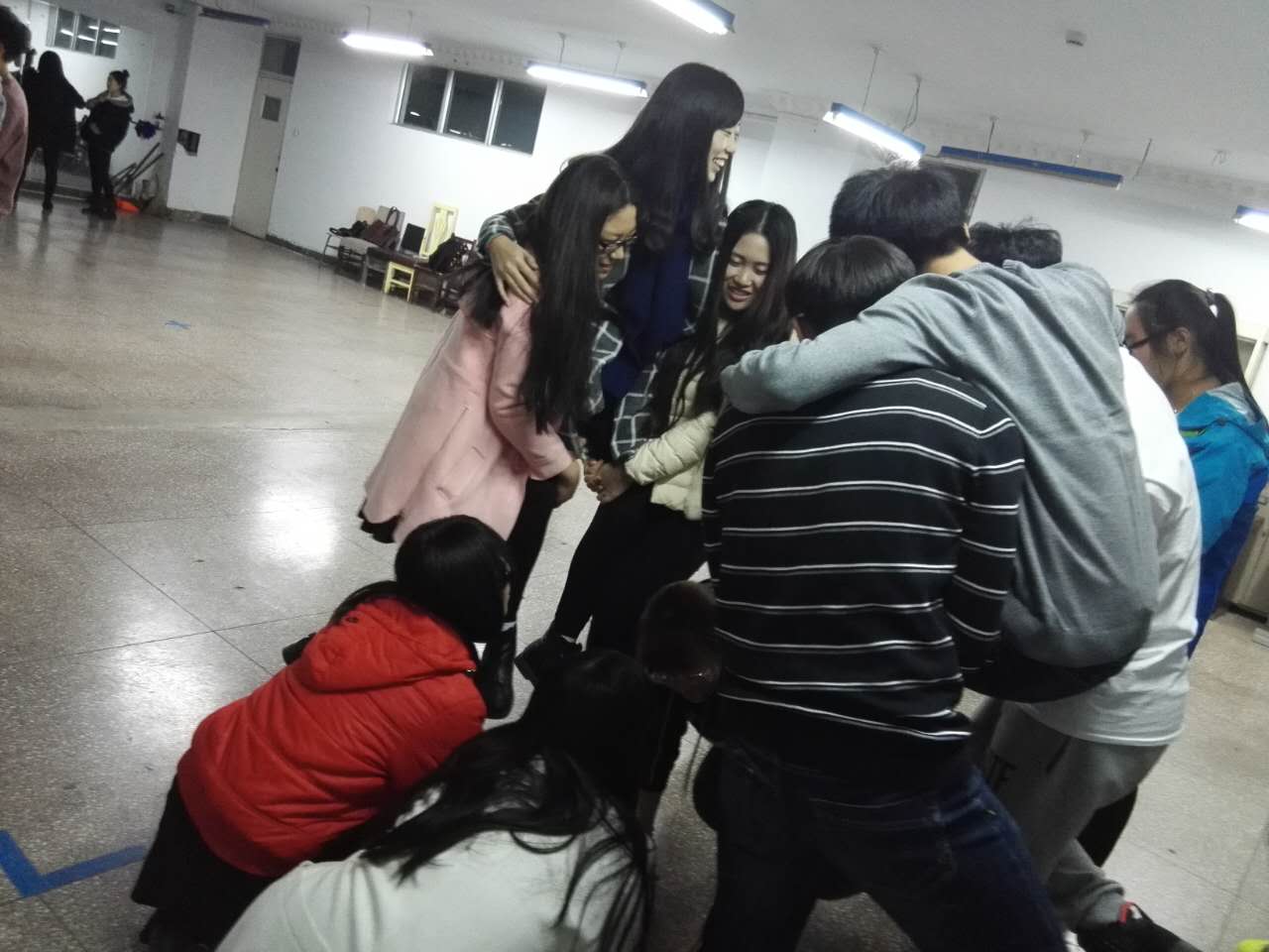 在主持人简短的开场白与规则介绍过后,团体心理辅导伴在游戏进行中拉开了序幕。很多人在游戏“乒乓球”中和游戏“七手八脚”中因平衡能力差而接受惩罚,特别是难度较大的“解开千千结”,当混乱的状态代替了秩序井然的圆圈,大家不得不动用自己的智慧和灵活性解开这个结,若失去了共同的目标,没有了一致的行动,那这个游戏只能是以失败而告终。