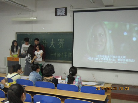 2014年5月20日,伟德团委A座109教室举办英语电影配音大赛决赛。有五组同学参加比赛。比赛分为四个环节。第一环节,才艺展示。第二环节,自选片段配音环节。第三环节是观众互动。第四环节是抽选片段配音。选手们充分展示了配音的技巧与能力,赢得观众们的阵阵掌声。
