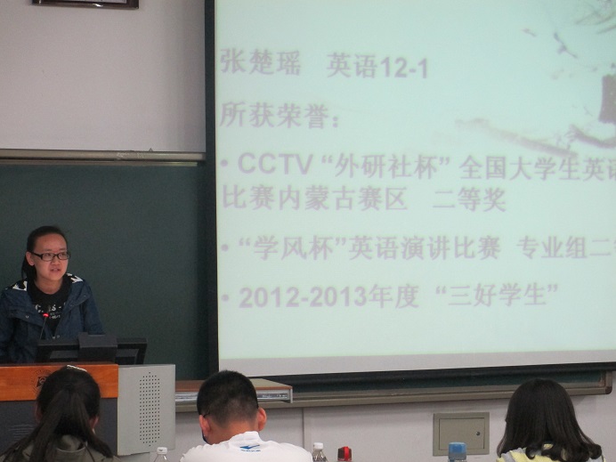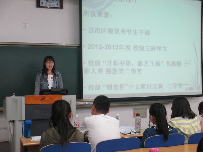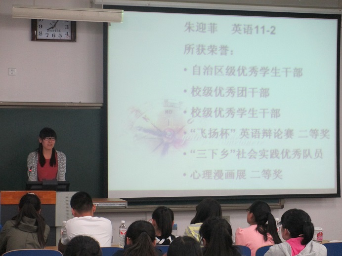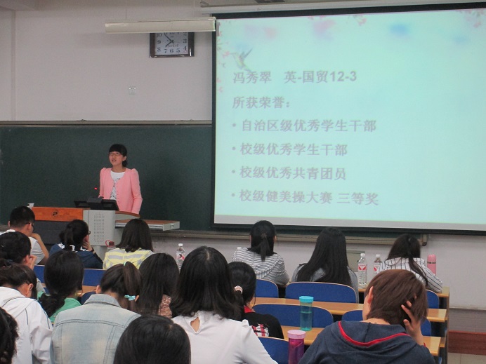 勤奋学习,热心助人的她是校级二、三等奖学金的获得者,能力出色的她还被评为自治区级优秀员工干部、校级优秀员工干部。她就是来自英语12-3班的冯秀翠同学。 “坚持不懈,执着努力”是她对大学的感悟,不要叹息过去是她的洒脱态度。身为班长的冯秀翠同学工作态度积极,工作能力强,更加难能可贵的是她的学习成绩也很优秀。她用自己的亲身经历,向学弟学妹们分享了自己的学习和工作心得。