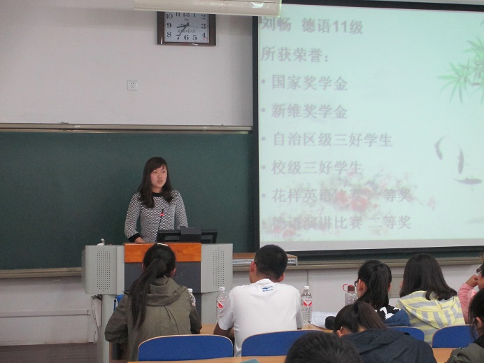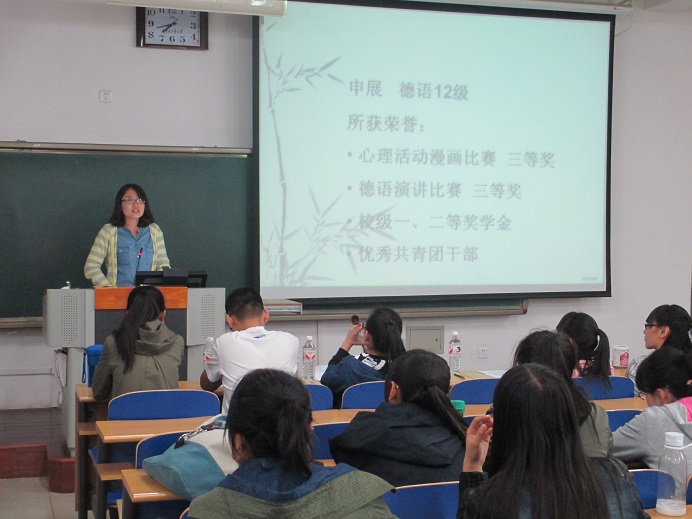 紧随其后的是来自德语12级的申展同学。她用自己的故事告诉那些高考失误或者被调剂的同学“是金子总会发光的”。她分享了学习德语的经验:要确立目标,努力坚持。同时,她告诉大家上课要认真听讲,勤记笔记,多记词汇。她鼓励大家要敢于开口说德语,多练听力;建议同学们要多去图书馆,多锻炼身体。