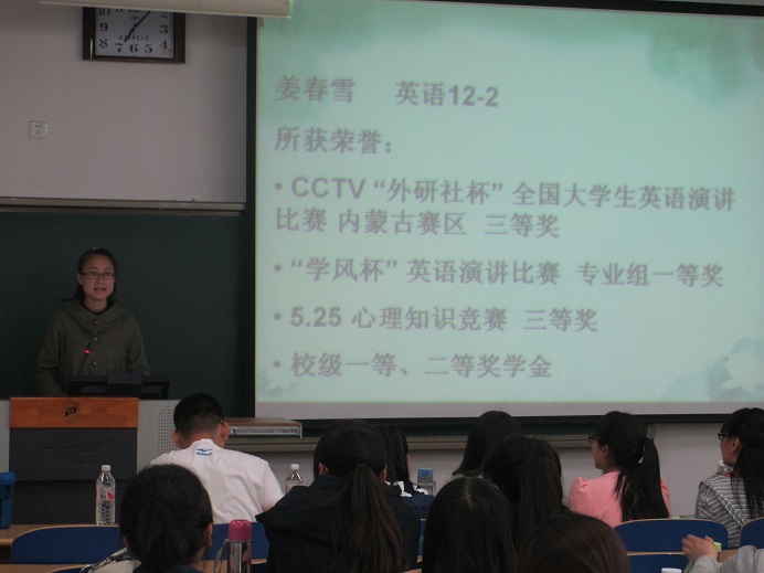 第二位做报告的是来自英11-3班的王洋。他感言老员工活过得很快,建议大家把握时间,珍惜时间,充分利用大学的美好时光。在学习方面,王洋同学提出语言学习的目的在于应用,建议同学们在听说读写方面打下坚实的基础。梦想不会被现实掩埋。