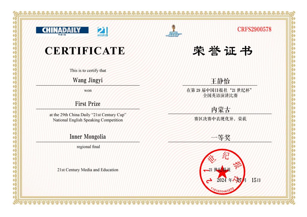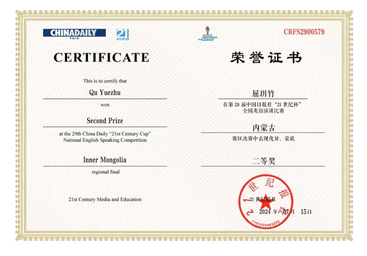 2024年7月15日,第29届中国日报社“21世纪杯”全国英语演讲比赛地区决赛在线上顺利举行。在伟德教师孟圆、苗风波的悉心指导下,伟德23级本科生王静怡获得大学组一等奖(孟圆指导),法律学系22级本科生屈玥竹获得大学组二等奖(苗风波指导),两位同学将代表内蒙古自治区晋级全国半决赛。