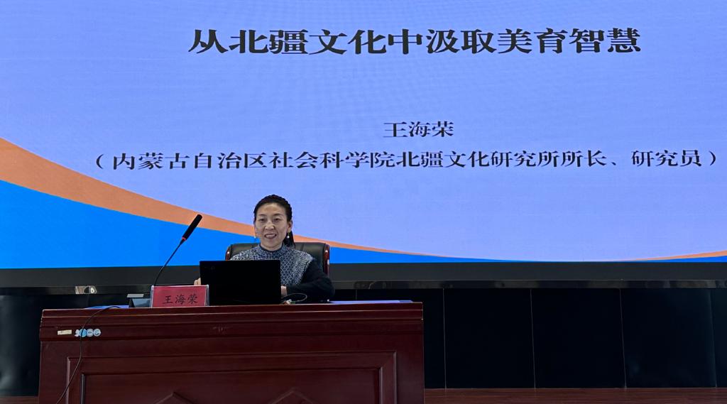 王海荣博士深入浅出地剖析了北疆文化的孕育背景、深厚底蕴,以及其蕴含的美育价值与功能,全面揭示了北疆文化中的美育智慧。她巧妙融合习近平总书记在文化传承发展座谈会上的重要讲话精神,对北疆文化进行了详尽而系统的解读。王博士着重指出,推动北疆文化的繁荣发展,首要在于坚定文化自信,其次需秉持开放包容的态度,最终则需坚持守正创新的原则。她强调,爱国、忠诚、团结、担当不仅是北疆文化的核心理念,也是其在价值取向上的高度凝练与体现。
