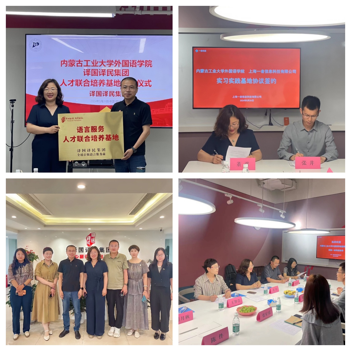 两家公司也详细介绍各自的业务范围,并表示会在员工定制化实习就业、教师教科研创新、现代化技术课程开发、特色译著出版等方面为公司提供支持,不断提升翻译人才培养质量,将校企合作落到实处。会谈后,公司与译国译民集团有限公司举行了语言服务人才联合培养基地的授牌仪式,与上海一者科技有限公司签署了《实习基地协议书》。