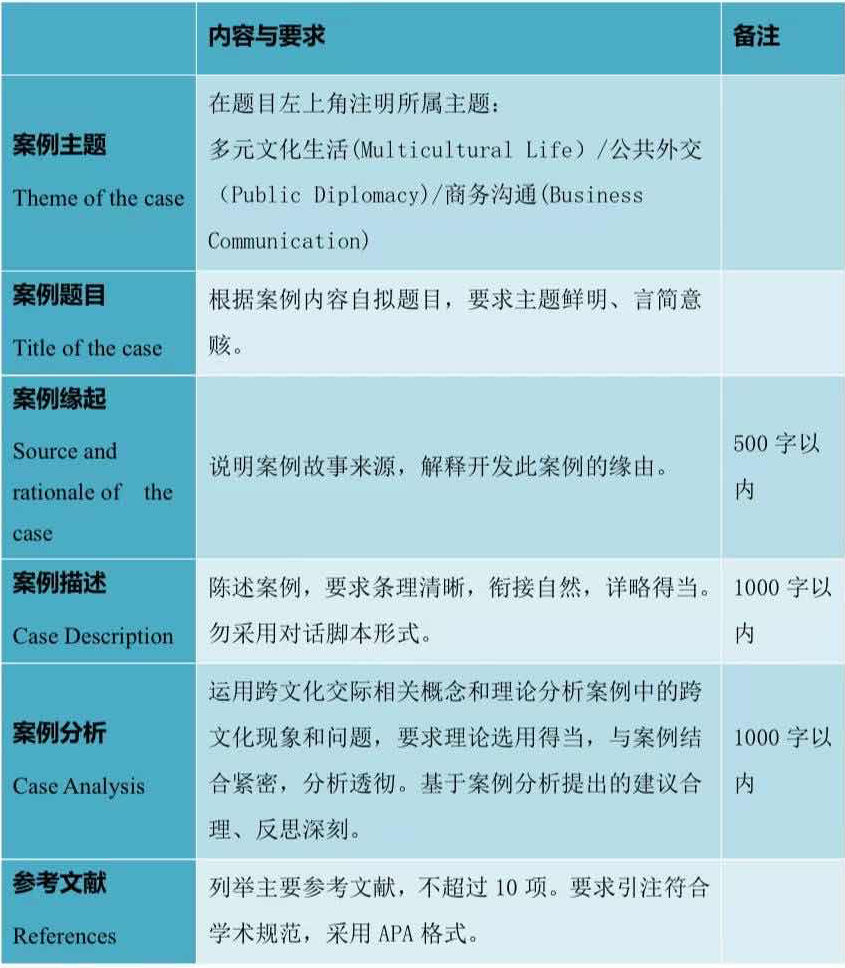 a) 案例脚本(见通知中附件1),文本用英文撰写,包括案例主题、题目、缘起、描述、分析和参考文献六个部分。