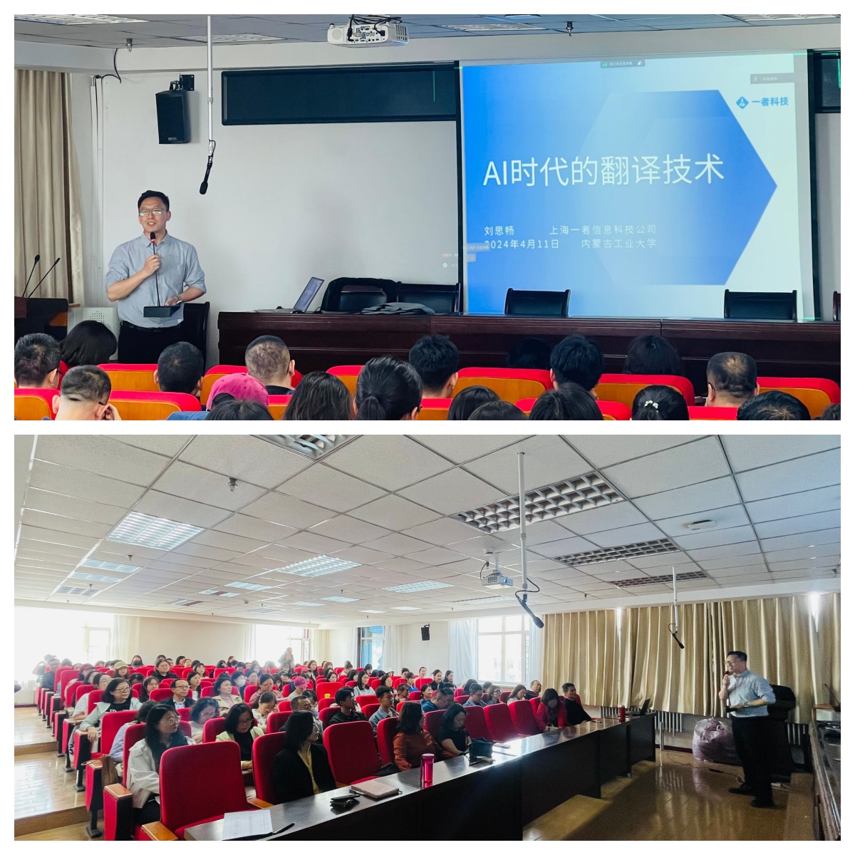 2024年4月11日下午,上海一者科技有限公司运营总监刘思畅应伟德邀请在电力大楼400会议室做题为“AI时代的翻译技术”专题讲座,公司全体硕士生导师、翻译方向教师以及2022级、2023级研究生参加。