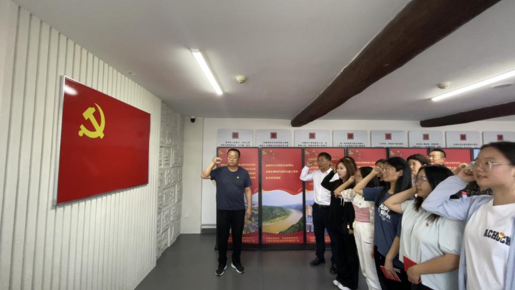参观结束后,新党员进行入党宣誓。党委书记郭凌峰,党委副书记、经理董君为新党员配发《中国共产党章程》、佩戴党员党徽。新党员整齐列队举起右拳,面向鲜红的党旗庄严宣誓。新党员代表、外语系教师贾建新发言,表达了感党恩、听党话、跟党走,献身党的教育事业的决心。